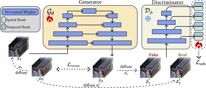 Diffusion-based video generation models have demonstrated remarkable success in obtaining high-fidelity videos through the iterative denoising process. However, these models require multiple denoising steps during sampling, resulting in high computational costs. In this work, we propose a novel approach to obtain single-step video generation models by leveraging adversarial training to fine-tune pre-trained video diffusion models. We show that, through the adversarial training, the multi-steps video diffusion model, i.e., Stable Video Diffusion (SVD), can be trained to perform single forward pass to synthesize high-quality videos, capturing both temporal and spatial dependencies in the video data. Extensive experiments demonstrate that our method achieves competitive generation quality of synthesized videos with significantly reduced computational overhead for the denoising process (i.e., around $23\times$ speedup compared with SVD and $6\times$ speedup compared with existing works, with even better generation quality), paving the way for real-time video synthesis and editing.